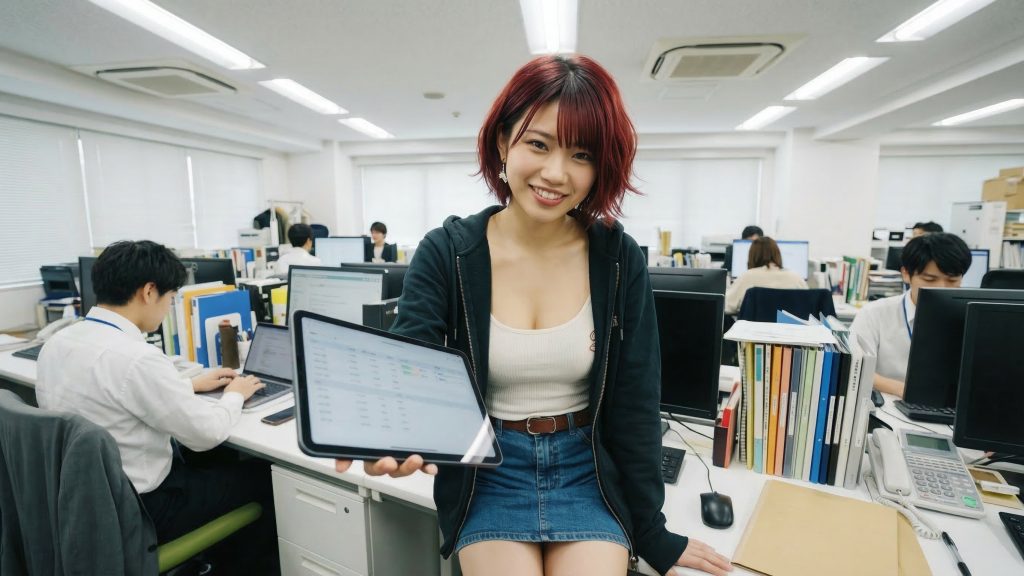 経営管理本部・情報システム部に所属する、赤髪がトレードマークの天才ハッカー。黒パーカーにデニムのタイトミニというラフな出で立ちですが、その実態は全社員の「ポイント履歴」を完全に掌握する、カーナルドライブ社内で最も機嫌を損ねてはいけない恐るべき存在です。