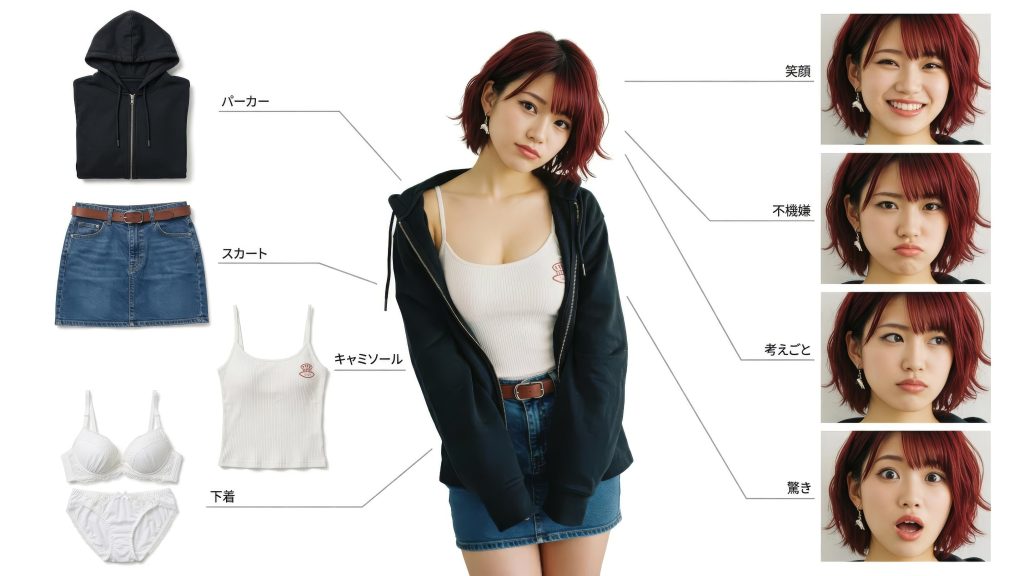 - 服装: 黒パーカーにキャミソール、デニムのタイトミニ。