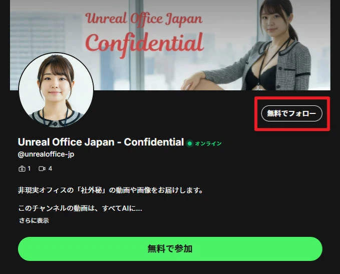 Fanvueの社外秘ファンサイトを開き、【無料でフォロー】をクリックします。